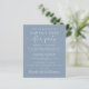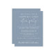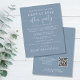 Elegant budgetvriendelijk stoffig blauw, behalve de datum die een receptie of feest ter gelegenheid van je huwelijksreis of privé-bruiloft aankondigt. "Sparen de Datum voor Onze gelukkig Ooit na Partij"wordt geschreven in eenvoudige witte typografie en een stijlvol wit manuscript met swashes. Pas uw aankondiging en sparen de datumdetails aan, en voeg uw namen in een handtekening-als manuscript toe. Op de rug, voer uw de websiteURL adres van de bruiloft aan creëer een QR code voor gasten in om met uw trouwfoto's en gebeurtenissen bij te houden, en uw eerste namen en bruiloft en ontvangstdata toe te voegen.