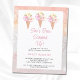 Deze budget bruidsdoucheuitnodiging met een ijsthema is versierd met drie waterverf ijskegels, bloemetjes en een pastelachtergrond. De tekst zegt: "Ze is opgepakt!" in stijlvolle roze typografie. Pas deze kaart aan door uw douchegegevens toe te voegen. Originele Waterverf © Michele Davies.