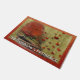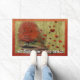 Vallende bladeren landschap monogrammed deur mat. Groen, geel, sinaasappel, roest en rood blazende bladeren gooiden de lucht van de verre bomen. Prachtige rustieke herfstlandschap en het gevoel van Herfst op een waarschuwen stenen achtergrond om uw inrichting voor het vakantieseizoen te verbeteren. Geweldig voor Amerikaanse en Canadese Thanksgiving Feestdagen.