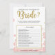 Deze moderne bloemige "Hoe goed ken je de bruid" heeft een roze bloemige achtergrond met gouden glittersplashes. De tekst is geschreven in een mix van een speelse kalligrafie-lettertype en een modern schreefloos lettertype, deze Hoe goed ken je de bruid kaart is gepersonaliseerd met de naam van de aanstaande bruid en de datum van de bruidsuitnodiging.
