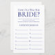 Dit eenvoudige, minimalistische, moderne marineblauwe "How Old Was The Bride?"-bruidsbeurs-spelblad is perfect voor elke bruidsbeurs. Dit leuke en makkelijke spel zal zeker veel gelach brengen naar elke bruidsfeest! Laat familie en vrienden je foto's van de bruid op verschillende leeftijden sturen en laat ze afdrukken. Nummer ze en leg ze bij deze spelbladen. Geef gewoon een blad aan elke gast (vergeet de pennen niet) en laat de competitie beginnen! Je zult verbaasd zijn hoeveel mensen de leeftijd van de bruid echt weten. In seconden kun je zien hoe je spelblad eruit zal zien. Selecteer gewoon "Personaliseer deze sjabloon" en typ de naam van de bruid in.