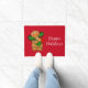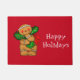 Prettige feestdagen Vakantie deurmat getoond met een rode achtergrond met een schattige peperkoek man. Pas deze mat aan of koop zoals hij is.