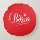 This holiday throw pillow is shown with a Believe print in a fancy script.