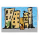 Kleine bruine hond met grote buggy ogen, rode halsband en een gele knarsetand die in de grote stad rondhangt. Originele digitale waterverf cartoon kunst door Taylor Addams.