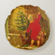Hongaarse kerstkaart op een aangepast rond kussen .Een klein meisje in rode jas houdt een boom vast en luidt de deurbel. Hoewel ze er niet arm uitziet, is ze blootsvoets. Een zeer speciaal briefkaart gedrukt op dit item .Bewerkt en toegepast op dit item door Alma Wad.