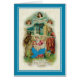 Een nostalgische Hongaarse kerstkaart met een prachtige oude afbeelding van Jezus, Mary en Joseph in de stal in Bethlehem met engelen hierboven. De groet in de Hongaarse taal, "Boldog Karacsonyt" Kerst in een gouden banner.