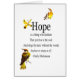 Citaat van Emily Dickenson: "Hoop is een ding met veren die in de ziel kruipen en de melodie zingt zonder de woorden en nooit stopt."