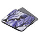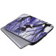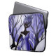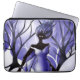 Een hoes van een horrorkunstlaptop met een donkere surrealistische illustratie van een hevig wezen dat lijkt op een vrouw met een zwarte huid en blaasende ogen die een prachtige violette jurk dragen in het sneeuwbos met onverlichte sneeuw met vreemde bomen. Gemengde media - inkt, waterverf en digitale kunst.