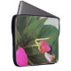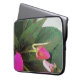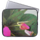 Het artwork op deze 15" Laptop Sleeve is een originele foto van MaeFlowers van een Nieuw Guinea impatiens plant, in bloei met hete roze bloemetjes. De foto is een close-up met daarin delen van de felroze bloemblaadjes, een bloemknop in een bleke roze kleur en de overblijfselen van een eerdere bloei. De donkergroene bladeren van de impatiënten zijn lang en puntig, met gekartelde randen tegen een warme lichtgrijze achtergrond. Het ontwerp heeft een wandtapijt textuur.