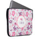 Manche d'ordinateur portable avec un motif floral mignon. Composé de fleurs irrégulières roses et violettes dans un style rétro des années soixante super. Petits coeurs bleus pâles, poivrez l'arrière - plan sur un fond bleu pâle. Un cercle blanc avec une bordure rose mignonne avec des points et des éclaboussures avec votre nom ou autre texte personnalisé au centre.