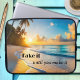 Manche d'ordinateur portable avec tableau d'un coucher de soleil sur une plage tropicale avec palmiers, avec vos textes (amusants ou autres) (en option).