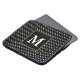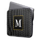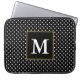 Un grand monogramme blanc est un carré noir avec une fausse bordure d'or. Les pois blancs sont sur cette manche noire d'ordinateur portable.