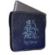Manche d'ordinateur portable avec le symbole de Sagittarius en bleu argenté doux, recouvert d'étoiles de la constellation, contre un arrière - plan étoilé du bleu profond de minuit au noir