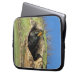 Protégez votre technologie avec l'air du sud-ouest avec cette pochette d'ordinateur portable avec une photo de la nature qui capture un regard saisissant de sa maison de cactus saguaro. La chair verte du saguaro et les aiguilles longues entourent cet oiseau du sud-ouest. Le bel oiseau noir regarde vers le ciel bleu vif.