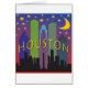 Artistieke renditie van Houston's kenmerkende wolkenkrabbers en het San Jacinto-monument in een levendige kleurenschema.