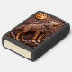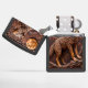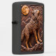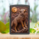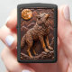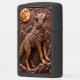 This lighter features a carved, high-relief image of a standing wolf on rocky terrain, looking up as if howling. A large, textured full moon and angular mountains dominate the background. The entire piece is rendered in a deep, monochromatic brown and orange-brown color palette, creating a strong three-dimensional effect. The wildlife scene is framed by stylized clouds at the top. The design is set on a matte black lighter casing. The design may look real due to the high detail in the artwork.