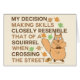 Mes qualifications de prise de décision ressemblent étroitement à cela d'un écureuil en traversant la rue. La typographie drôle d'énonciation avec un graphique confus mignon d'écureuil avec les glands et le chêne part dans brun, l'orange et le vert.