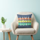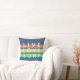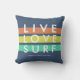 Blauwe decoratieve gooikussens met zonnegekleurde strepen in perzik, groen en geel gekleurd met de vermelding "levend, liefje, surf". Gepersonaliseerd met Huntington Beach, Californië, maar de tekst kan worden veranderd in plaats van uw keus. Geweldig voor een casual strandhuis voor iedereen die van surfen houdt.