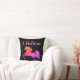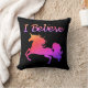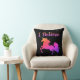 Een intens roze, dun en korrelig eenhoorn design op zwarte kussen voor gelovigen.