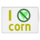 Ik haat maïs. Het ontwerp gebruikt gele letters, een groen hart en het internationale "NEE"-teken om te lezen: "Ik haat maïs". Voor degenen die het niet "hart" zijn.