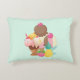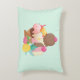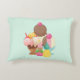 Een accentkussen geïllustreerd met een tekening van een 3-scoop ijszonnebrand met kleurrijke sprinkles. Een ijskegel met schep chocolade, aardbei en vanille. Een kom neopolitaans ijs met een kers erop. Aardbeien en een ananasvrucht zitten naast de kommen. Zomer en zoet.