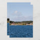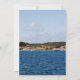 Zweeds kustlandschap met blauw water en lucht en rode huisjes en een boot. Fotografie.