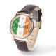 Bruin lederen perfect vierkant eWatch horloge met een afbeelding dat de vlag van Ierland voorstelt. De groene kleur op de vlag staat voor de inheemse bevolking van Ierland (die meestal rooms-katholiek zijn). De oranje kleur symboliseert de Britse aanhangers van Willem van Sinaasappel die zich in de 17e eeuw in Noord-Ierland vestigden (waarvan de meesten protestants zijn). Het wit in het midden van de vlag staat voor vrede tussen deze twee groepen mensen. Optionele wijzerplaat. Bekijk het hele St. Patrick’s Day Wrist Watch collectie in de sectie FEESTDAGEN.