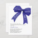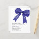 Een elegante witte achtergrond, versierd met grote donkerblauwe boog. Personaliseer en voeg een naam en partijgegevens toe. Tekst: Iets blauw voor ik het doe. 1 vel = 1 uitnodiging gedrukte rand tot rand.