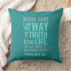 Sierkussennen met het bijbelse vers van John 14:6 Jezus vertelde hem: "Ik ben de weg, de waarheid en het leven. Niemand kan naar de Vader komen, behalve door mij." De verzen zijn in blauwe pastelkleuren en in gemengde kalligrafie en minimalistische typografie. Dit trendy, moderne geloof ontwerp is het perfecte geschenk en mode statement. #Christelijk #religie #scriptie #geloof #bible #jesus