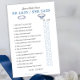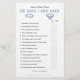 Commencez vos rires avec ce jeu de douche nuptiale He Said / She Said! Doté d'élégantes icônes en diamant et en bande mariage, d'une typographie marine propre et d'un accent bleu moderne, cette carte imprimable s'intègre parfaitement dans un thème sophistiqué "quelque chose de bleu". Les invités devinent quelles déclarations appartiennent à la mariée ou au marié, marquant leurs choix pour obtenir les réponses les plus correctes. Un grand brise-glace pour les douches nuptiales ou les douches pour couple! Personnalisez facilement le haut avec le nom de la mariée ou changez les questions en une question plus personnalisée.