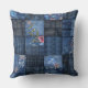 A seamless indigo patchwork pattern throw pillow featuring floral details and textured plaid squares. The mix of denim blues, delicate blossoms, and stitched textures creates a cozy boho aesthetic.