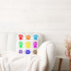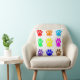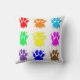 Decoratieve kussen. Een kleurrijk patroon van de vingerafdrukken van de hondenpoot met een inktsplaatsteffect. Ontwerp in rood, oranje, lichtblauw, groen, geel, roze, paars donkerblauw en bruin.