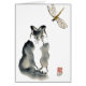 Le chaton joue dans la cour par la caractéristique de l'eau quand bourdonne dedans une libellule - un insecte désagréable. Sumi-e, peinture d'encre de zen par Ellen Miffitt aka studio des neuf vies