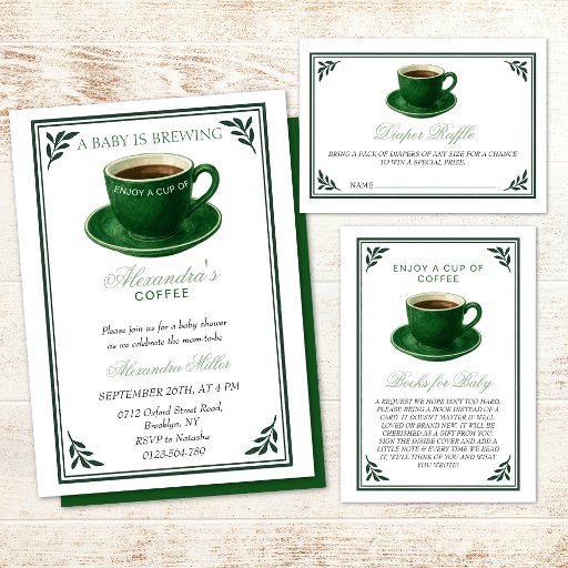 This design features a old money vintage baby shower theme "A Baby Is Brewing" with a green coffee cup illustration and elegant borders giving it a luxury coffee shop vibe. This product can be easily personalized. If you need help with the customization of the product or need matching products kindly please contact me via Zazzle.
