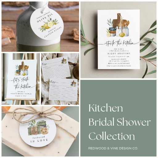 Invitations amis et famille à une douche nuptiale à thème "stock la cuisine" avec ces invitations mignonnes et charmantes avec un groupement de fournitures de cuisine et des citrons rendus dans des aquarelles douces. Personnalisez avec vos détails de douche de cuisine en lettres modernes.