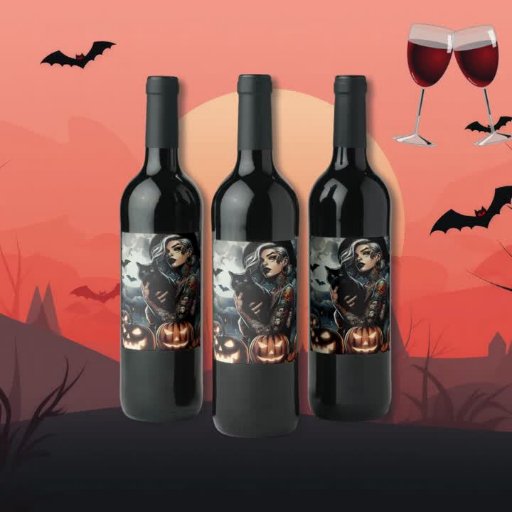 Invitations de fête d'Halloween. Prenez votre balai et survolez-vous ! sorcière tatouée gothique éffrayante avec un chat noir, des chauves-souris et des graphiques pleine lune.