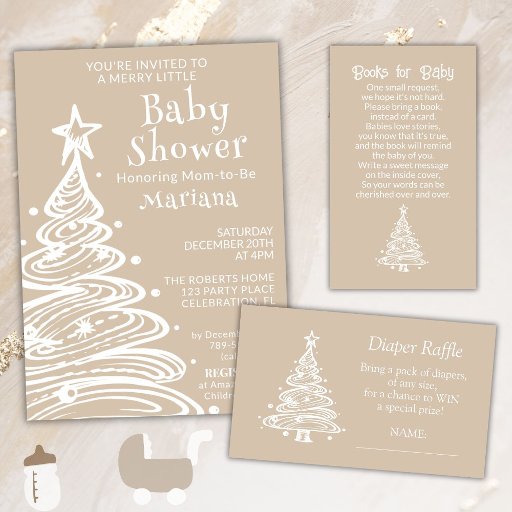 Couples baby shower neutre genre sapin de Noël Boho beige baby shower invitation avec une mignonette whimsical plaisir baby shower invitation pour un baby shower de vacances festif.