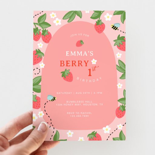 Invitation Berry First Pink Strawberry Bees Birthday Party