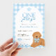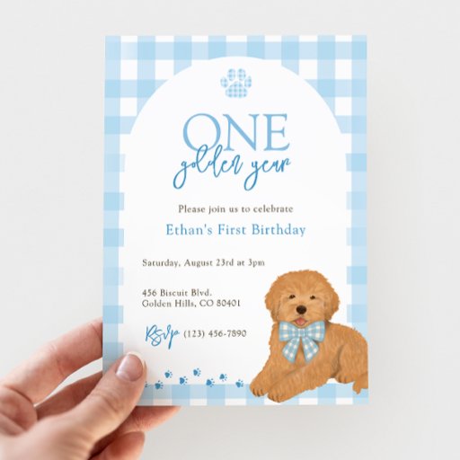 Celebrate your little boy's first birthday with this "One Golden Year" birthday invitation. This adorable invitation features blue gingham, a golden doodle wearing a blue bow, and playful paw prints. Perfect for dog loving families, this sweet design adds a charming touch to any first birthday party.