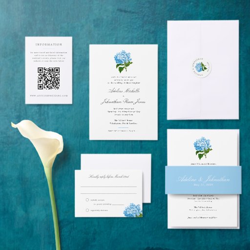 Facile à customiser texte formel et élégant invitations invités à célébrer l'union d'un couple dans le mariage. Nouveau style traditionnel grand-millénaire avec une palette de couleurs vives de bleu et vert français avec beaucoup de blanc clair et aéré et une parfaite illustration de fleur d'hydrangée bleue antique.