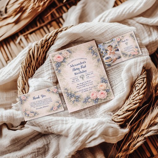 This soft blueberry garden collection features delicate florals and mixed berry details arranged in a romantic storybook frame. The airy ivory background and muted blue tones create a timeless, elegant look perfect for a Berry First celebration. Designed to feel refined yet playful, this collection works beautifully for garden parties, spring celebrations, and sweet first birthdays with a classic botanical aesthetic.