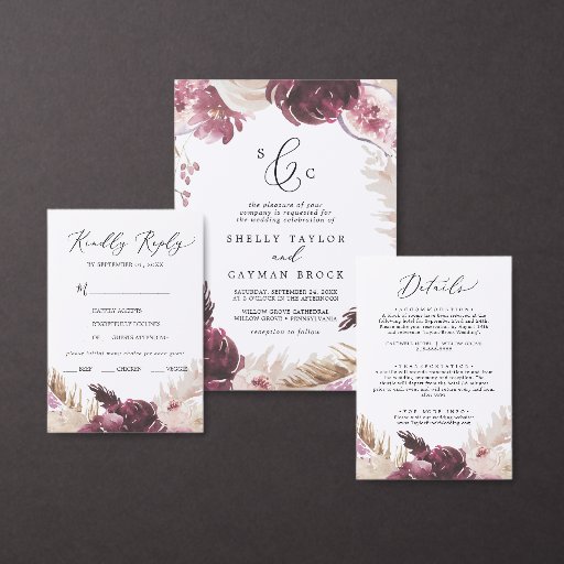 Cette invitation à la répétition de la pampa herbe boho est parfaite pour une répétition mariage d'été. L'aquarelle fleurie présente des fleurs bohèmes bordeaux et roses rousses avec des sprigs d'herbe pampa neutre.