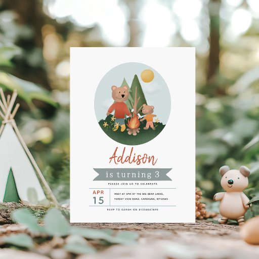 This cute and modern camping birthday invitation features cute woodland bear illustrations with a fire and s’mores, flowers, and forest trees — perfect for a 2nd, 3rd or 4th birthday party. Designed in soft blue and earthy tones for a gender-neutral Happy Camper theme, it’s ideal for a teddy bear birthday, woodland party or outdoor adventure celebration. The reverse includes a coordinating camping pattern.