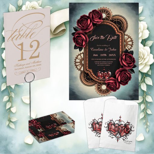 Invitation Cadre Steampunk avec Roses rouges et Engrenages
