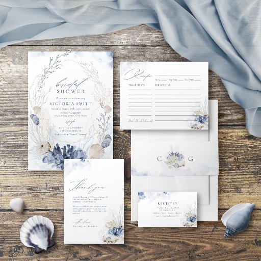 Elégante sous la mer thème de la plage nuptiale invitation à la douche comprend corail et coquillages couleur bleu poussiéreux, script élégant et détails de police classe, moderne et romantique, idéal pour le mariage de plage d'été sur le thème de la mer, mariage de destination tropicale d'hiver, mariage sur le thème de l'océan côtier. Voir toutes les pièces correspondantes dans la collection.