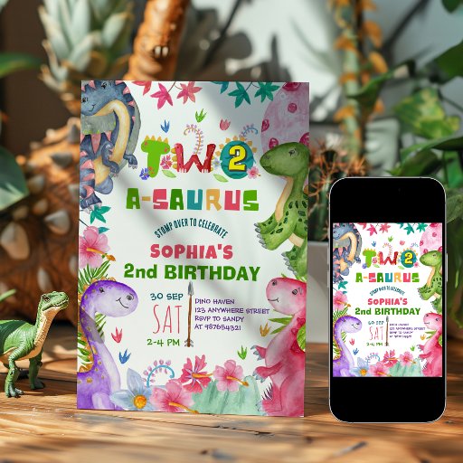 Invitation d'anniversaire 2 ans dinosaure fille mignonne