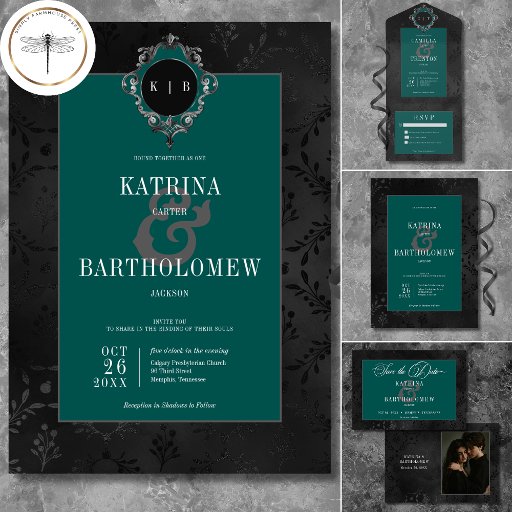Entrez dans un monde d'élégance sombre avec notre faire-part de mariage gothique captivante. Encadrée par un superbe papier peint vintage satiné noir sur noir damassé, cette invitation dégage un air de mystère et de charme intemporel. La zone de texte arrière - plan en vert turquoise riche ajoute une touche de couleur. Avec un look vieillot qui respire le raffinement, cette invitation est un mélange parfait d'allure d'antan et d'attrait contemporain. Admirez le charme du passé et invitations de vos invités pour assister à un amour qui transcende le temps avec ce faire-part de mariage gothique captivant. Créé par Simply Farmhouse Press.
