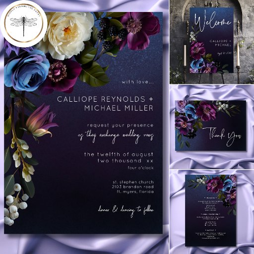 Invitation Dark Moody Blue Lavender Floral Moderne Mariage