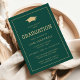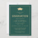 Cette invitation simple et moderne à la remise des diplômes comporte un texte de couleur or surmonté d'un casquette en carton doré sur un arrière - plan vert foncé. Le mot "Graduation" apparaît dans un style sportif classique idéal pour un athlète étudiant. Customisez l'invitation avec le nom du diplômé et les détails du parti. Le dos de la carte est vert solide.