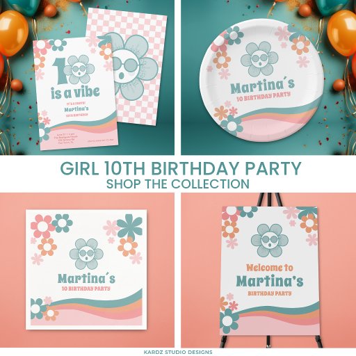 Invitation unique aux filles 10ème anniversaire de fête! Avec un design "10 is a Vibe", cet invitation d'anniversaire, de style rétro, incarne l'esprit joyeux d'une décennie vécue au maximum. Chaque invitation présente un design marguerrier souriant et cool, parfaitement assorti à des lettres rétro vibrantes qui font une déclaration passionnante. Le thème "10 est une Vibe" fera sourire tout le monde et donnera l'ambiance d'une fête amusante. Personnalisez cette invitation en ligne avec tous les détails du grand jour de votre petit. Disponible pour acheter des impressions ou télécharger l'invitation numérique pour un faire-part d'événement rapide, facile et beau. Design original par Ana Garza/Kardz Studio. Si vous avez des questions, n'hésitez pas à me contacter par l'intermédiaire du Conversation Zazzle.